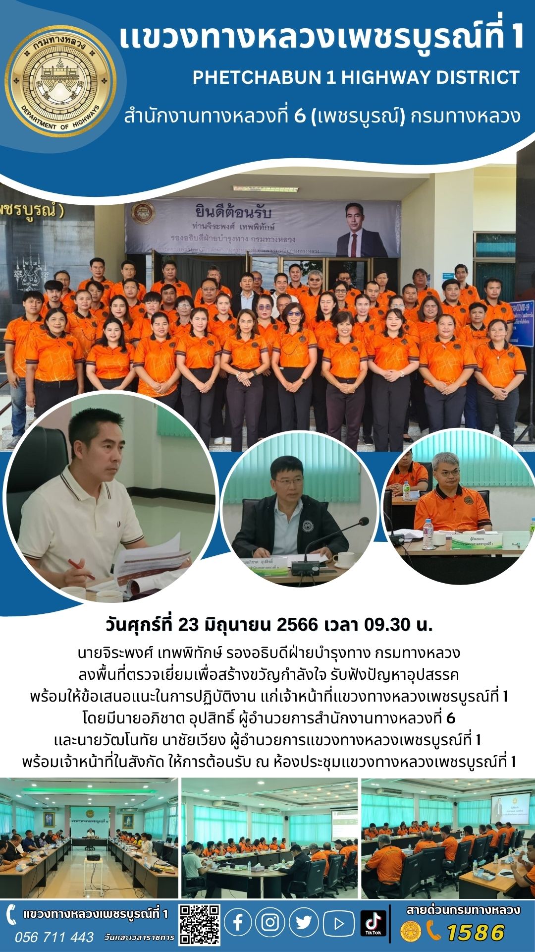 นายจิระพงศ์ เทพพิทักษ์ รองอธิบดีฝ่ายบำรุงทาง กรมทางหลวง ลงพื้นที่ตรวจเยี่ยมเพื่อสร้างขวัญกำลังใจ รับฟังปัญหาอุปสรรคพร้อมให้ข้อเสนอแนะในการปฏิบัติงาน แก่เจ้าหน้าที่แขวงทางหลวงเพชรบูรณ์ที่ 1