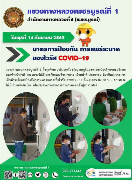 วันพุธที่ 14 กันยายน 2565 แขวงทางหลวงเพชรบูรณ์ที่ 1 ตั้งจุดคัดกรองด้วยเครื่องวัดอุณหภูมิและลงทะเบียนไทยชนะบริเวณทางเข้าหน้าสำนักงาน ตรวจวัดไข้ และคัดกรองข้าราชการ เจ้าหน้าที่ ประชาชน ที่มาติดต่อราชการเพื่อเฝ้าระวังและป้องกันการแพร่ระบาดเชื้อไวรัส COVID – 19