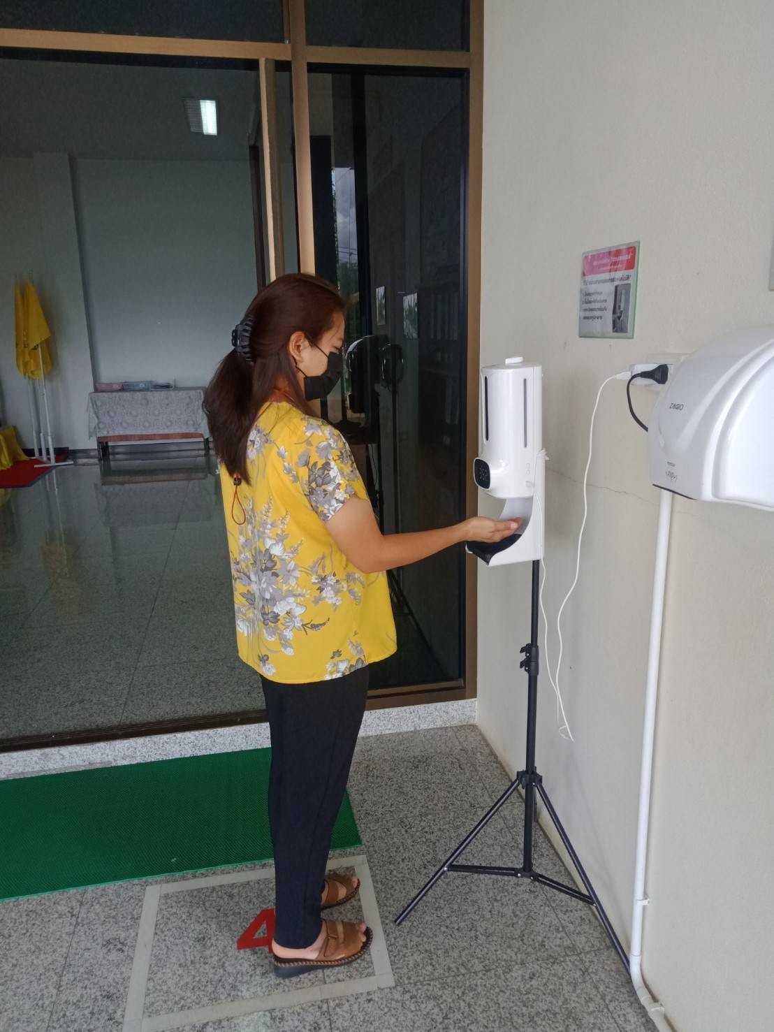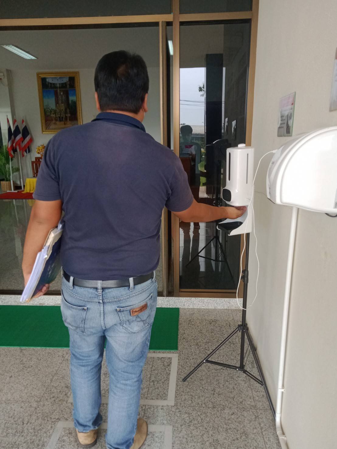 ตั้งจุดคัดกรองด้วยเครื่องวัดอุณหภูมิและลงทะเบียนไทยชนะ บริเวณทางเข้าหน้าสำนักงาน ตรวจวัดไข้ และคัดกรองข้าราชการ เจ้าหน้าที่ ประชาชน ที่มาติดต่อราชการ เพื่อเฝ้าระวังและป้องกันการแพร่ระบาดเชื้อไวรัส COVID – 19