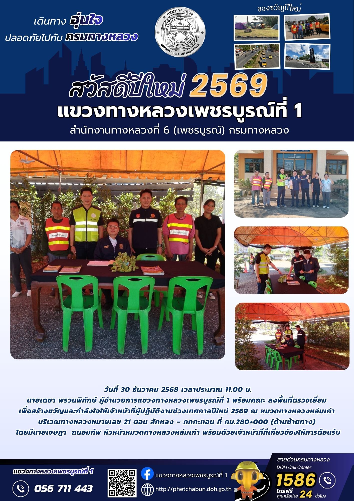 นายเดชา พรวนพิทักษ์ ผู้อำนวยการแขวงทางหลวงเพชรบูรณ์ที่ 1 พร้อมคณะ ลงพื้นที่ตรวจเยี่ยม เพื่อสร้างขวัญและกำลังใจให้เจ้าหน้าที่ผู้ปฏิบัติงานช่วงเทศกาลปีใหม่ 2569 ณ จุดให้บริการทั่วไทย (สามเเยกเเคมป์สน)