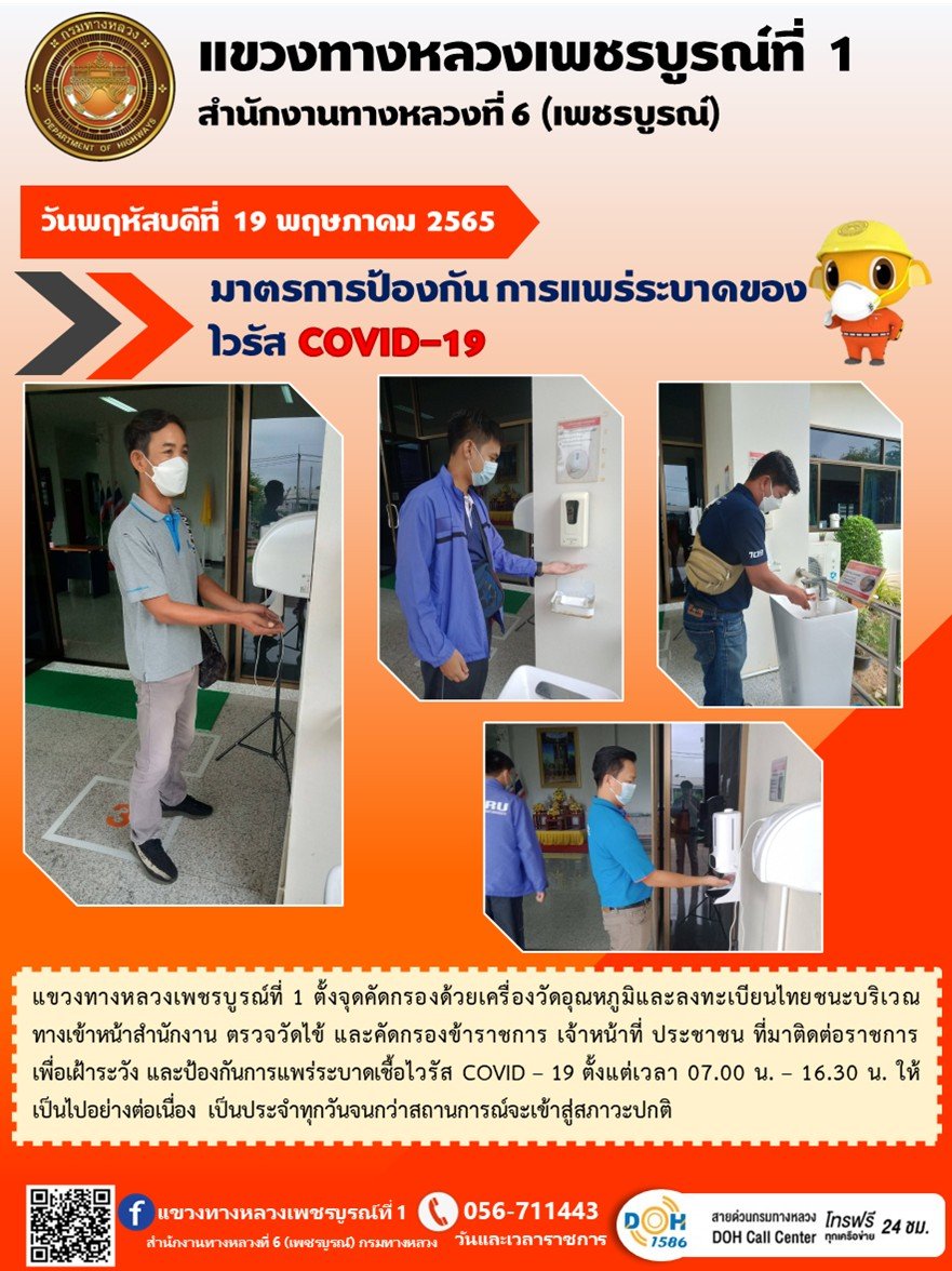 วันพฤหัสบดีที่ 19 พฤษภาคม 2565 แขวงทางหลวงเพชรบูรณ์ที่ 1 ตั้งจุดคัดกรองด้วยเครื่องวัดอุณหภูมิและลงทะเบียนไทยชนะ