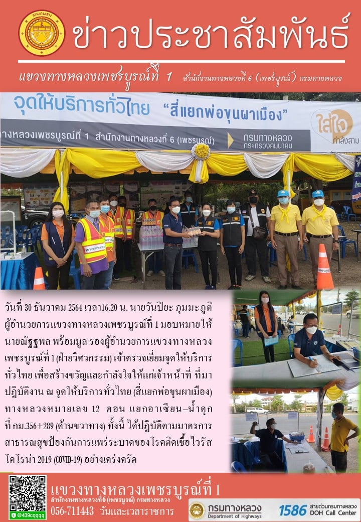 ตรวจเยี่ยมจุดให้บริการทั่วไทย เพื่อสร้างขวัญและกำลังใจให้แก่เจ้าหน้าที่ ที่มาปฏิบัติงาน ณ จุดให้บริการทั่วไทย (สี่แยกพ่อขุนผาเมือง) ทางหลวงหมายเลข 12 ตอน แยกอาเซียน–น้ำดุก ที่ กม.356+289 (ด้านขวาทาง)