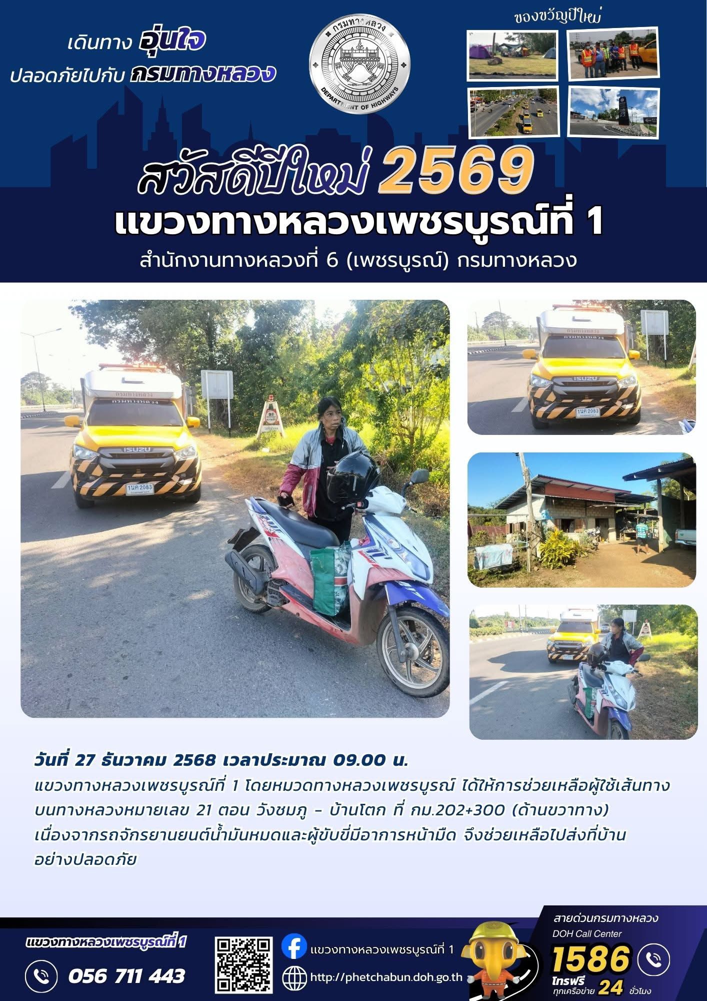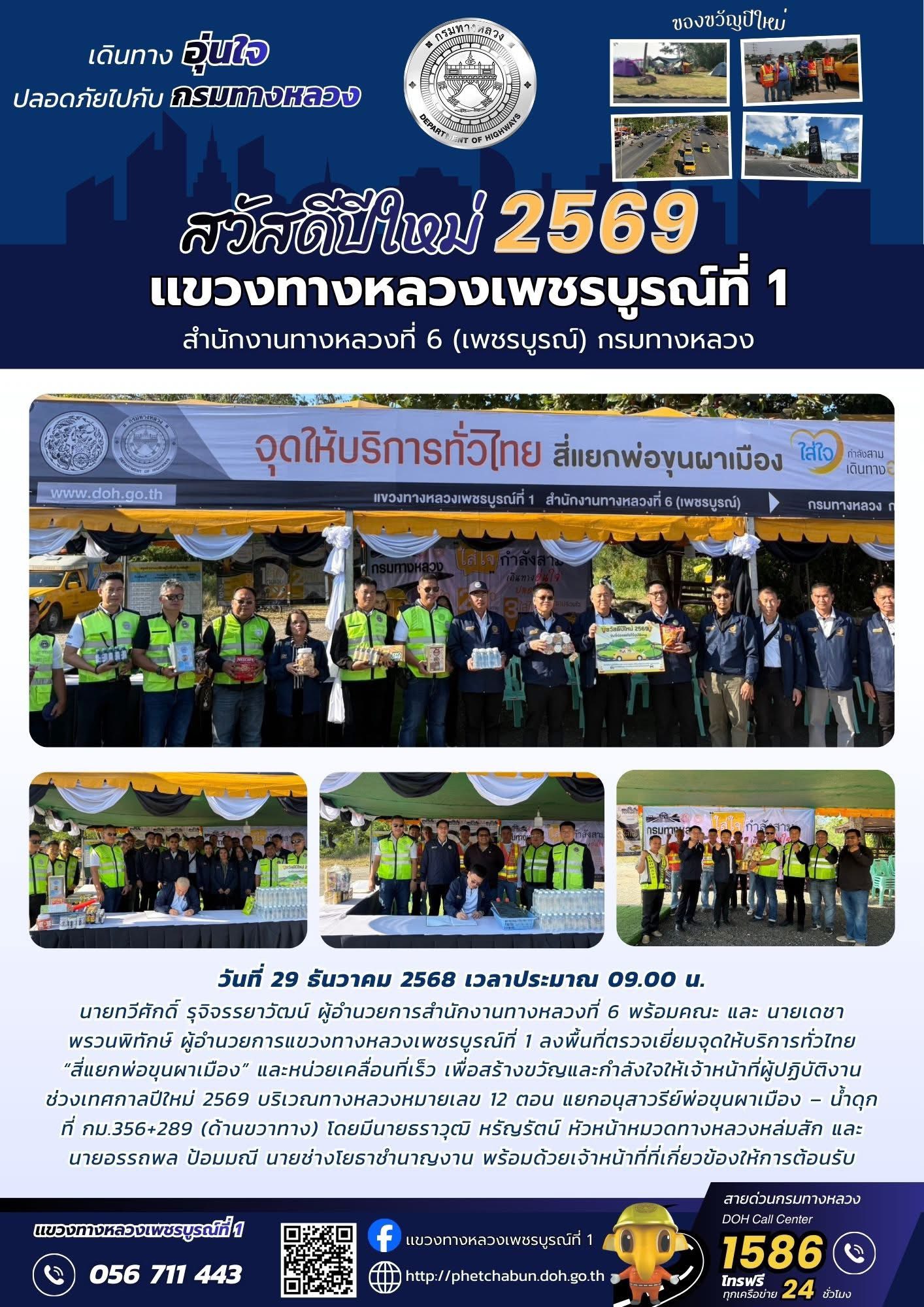 แขวงทางหลวงเพชรบูรณ์ที่ 1 จัดกิจกรรมเปิดศูนย์ปฏิบัติการเเละกิจกรรมปล่อยขบวนรถเพื่ออำนวยความสะดวกปลอดภัย รองรับการเดินทางของประชาชนช่วงเทศกาลปีใหม่ 2569 ระหว่างวันที่ 26 ธันวาคม 2568 ถึง วันที่ 5 มกราคม 2569 (รวม 11 วัน)