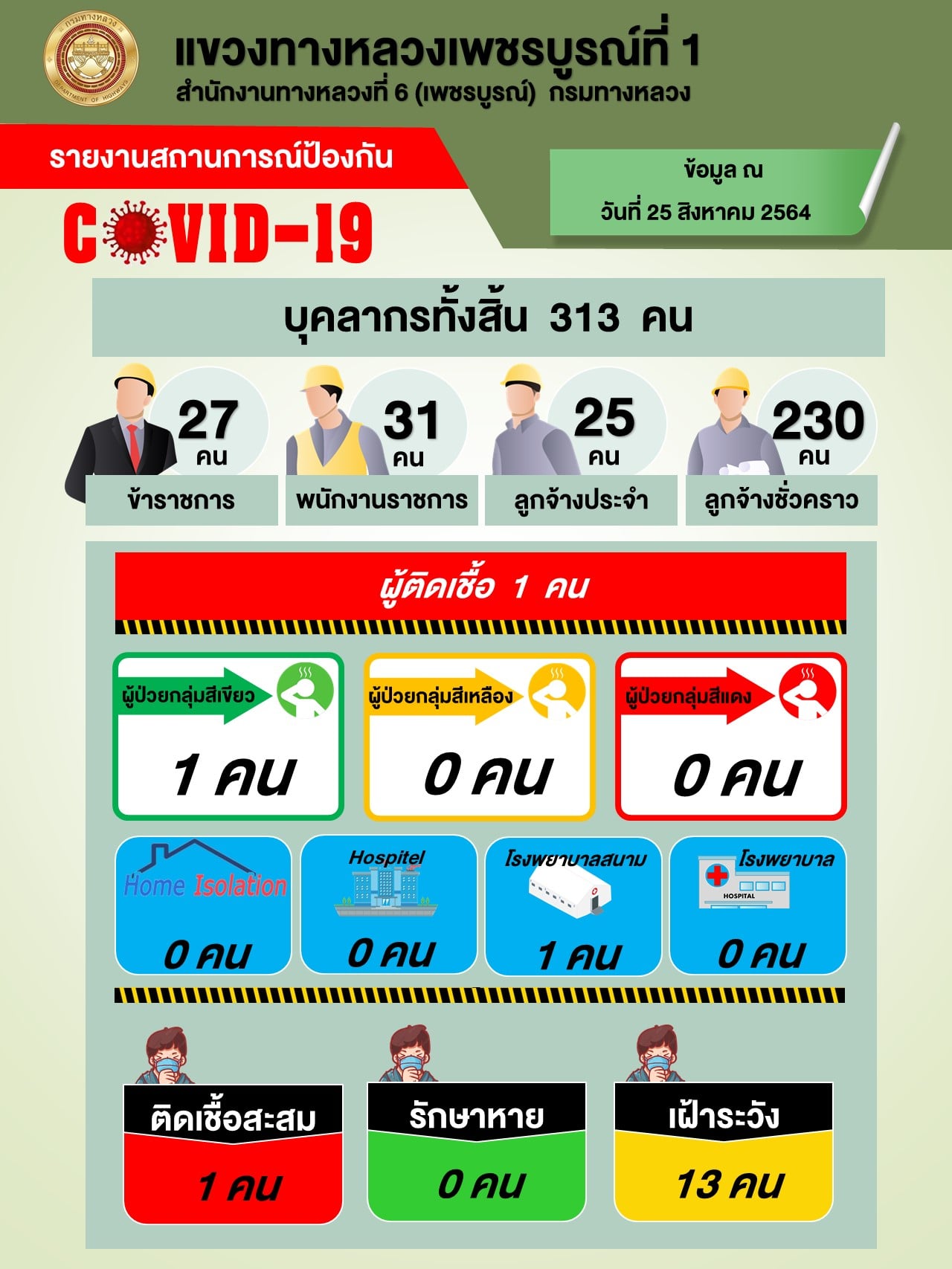 รายงานสถานการณ์ COVID-19 แขวงทางหลวงเพชรบูรณ์ที่ 1 ประจำวันที่ 25 สิงหาคม 2564