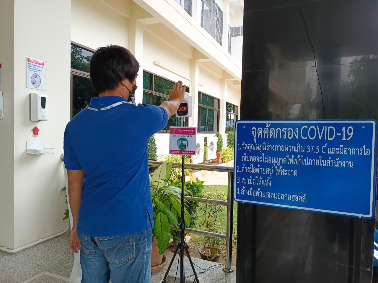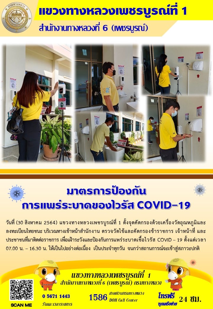 แขวงทางหลวงเพชรบูรณ์ที่ 1 จัดตั้งตู้พ่นน้ำยาฆ่าเชื้อ และจุดคัดกรองด้วยเครื่องวัดอุณหภูมิ วันที่ 30 สิงหาคม 2564 ตั้งแต่เวลา 07.00 น. – 16.30