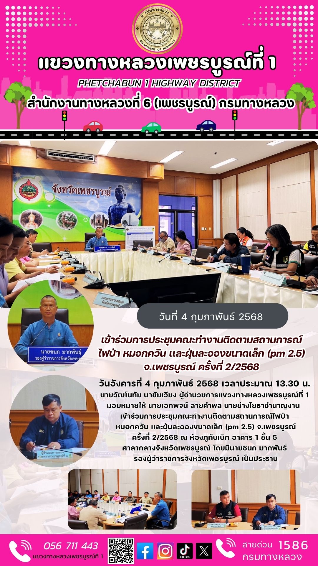 ขอเชิญเข้าร่วมการประชุมการมีส่วนร่วมของประชาชน โครงการพัฒนาโครงสร้างพื้นฐานด้านการท่องเที่ยว ทางหลวงหมายเลข 2196 กิจกรรมเพิ่มประสิทธิภาพทางหลวงสู่แหล่งท่องเที่ยว ทางหลวงหมายเลข 2196 ตอนควบคุม 0101 ตอน นางั่ว – ทุ่งสมอ ระหว่าง กม.33+900 – กม.35+500 (แยกตลาดพัฒนา) ตำบลเขาค้อ อำเภอเขาค้อ จังหวัดเพชรบูรณ์ เพื่อรับฟังข้อมูลโครงการ พร้อมร่วมแสดงความคิดเห็น อันจะเป็นประโยชน์ต่อโครงการ ในวันพฤหัสบดีที่ 24 เมษายน 2568 เวลา 09.00 – 11.30 น. ณ หอประชุมอำเภอเขาค้อ จังหวัดเพชรบูรณ์