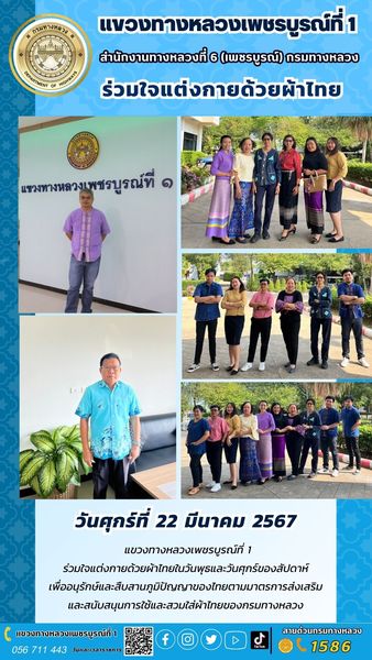แขวงทางหลวงเพชรบูรณ์ที่ 1 ร่วมใจแต่งกายด้วยผ้าไทยในวันพุธและวันศุกร์ของสัปดาห์ เพื่ออนุรักษ์และสืบสานภูมิปัญญาของไทยตามมาตรการส่งเสริมและสนับสนุนการใช้และสวมใส่ผ้าไทยของกรมทางหลวง