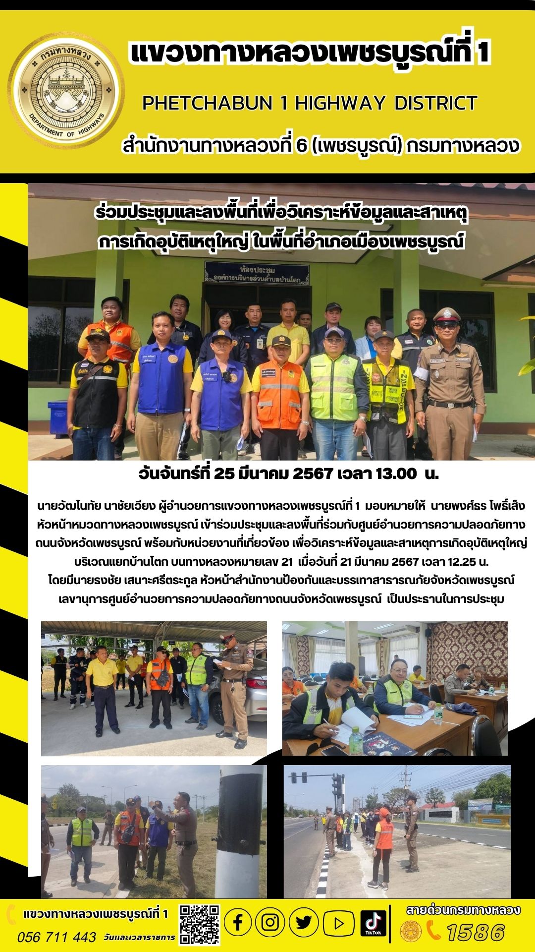 เข้าประชุมเเละลงพื้นที่ร่วมกับศูนย์อำนวยการความปลอดภัยทางถนนจังหวัดเพชรบูรณ์ พร้อมกับหน่วยงานที่เกี่ยวข้อง เพื่อวิเคราะห์ข้อมูลและสาเหตุการเกิดอุบัติเหตุใหญ่ บริเวณแยกบ้านโตก บนทางหลวงหมายเลข 21 เมื่อวันที่ 21 มีนาคม 2567 เวลา 12.25 น.