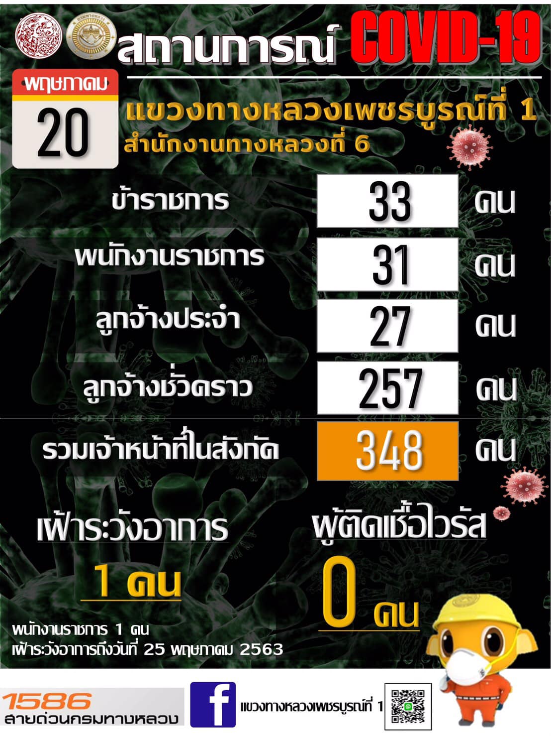 รายงานสถานการณ์ COVID-19 แขวงทางหลวงเพชรบูรณ์ที่ 1 ประจำวันที่ 20 พฤษภาคม 2563