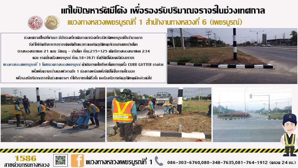 แขวงทางหลวงเพชรบูรณ์ที่ 1 โดยหมวดทางหลวงเพชรบูรณ์ ดำเนินการแก้ไขปัญหาโดยการขุดรื้อ CURB GUTTER บางส่วนเพื่อเพิ่มความกว้างของผิวทางอีก 1 ช่องทางพร้อมเพิ่มรัศมีโค้งในการเลี้ยวออก เพื่อรองรับปริมาณจราจรในช่วงเทศกาลฯ ทำให้ระบายรถได้เร็วขึ้น และป้องกันการเกิดอุบัติเหตุดังกล่าวต่อไป