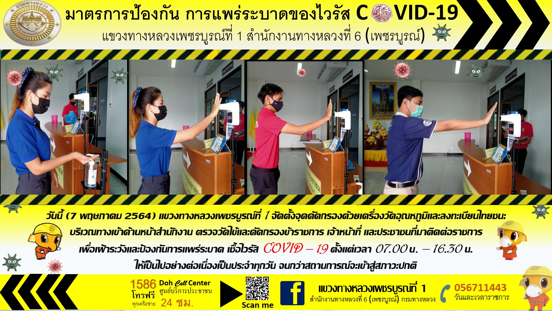 แขวงทางหลวงเพชรบูรณ์ที่ 1 จัดตั้งตู้พ่นน้ำยาฆ่าเชื้อ และจุดคัดกรองด้วยเครื่องวัดอุณหภูมิ วันที่ 7 พฤษภาคม 2564 ตั้งแต่เวลา 07.00 น. – 16.30 น.