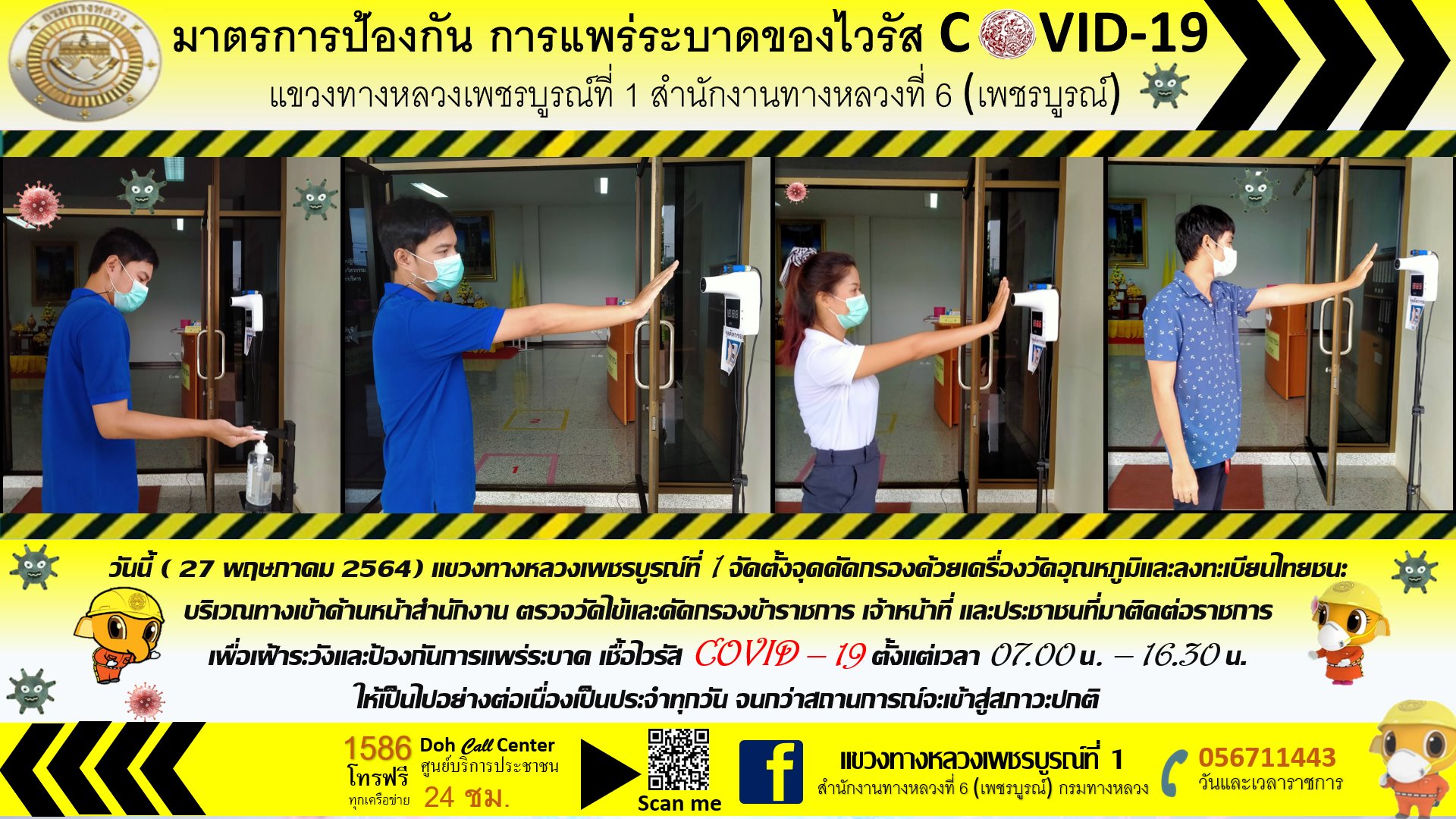 แขวงทางหลวงเพชรบูรณ์ที่ 1 จัดตั้งตู้พ่นน้ำยาฆ่าเชื้อ และจุดคัดกรองด้วยเครื่องวัดอุณหภูมิ วันที่ 28 พฤษภาคม 2564 ตั้งแต่เวลา 07.00 น. – 16.30 น.