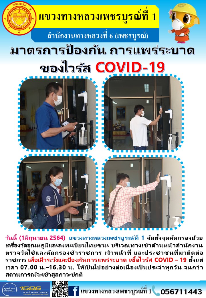 แขวงทางหลวงเพชรบูรณ์ที่ 1 จัดตั้งตู้พ่นน้ำยาฆ่าเชื้อ และจุดคัดกรองด้วยเครื่องวัดอุณหภูมิ วันที่ 1 มิถุนายน 2564 ตั้งแต่เวลา 07.00 น. – 16.30 น.