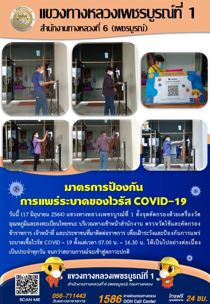 แขวงทางหลวงเพชรบูรณ์ที่ 1 จัดตั้งตู้พ่นน้ำยาฆ่าเชื้อ และจุดคัดกรองด้วยเครื่องวัดอุณหภูมิ วันที่ 17 มิถุนายน 2564 ตั้งแต่เวลา 07.00 น. – 16.30 น.