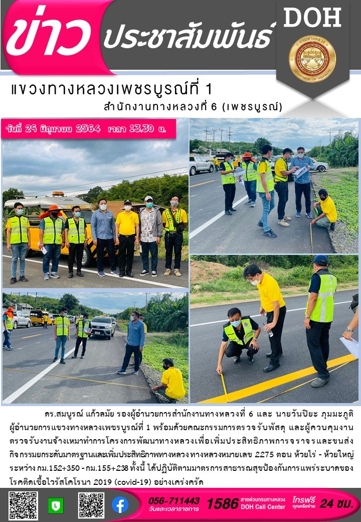 ดร.สมบูรณ์ แก้วลมัย รองผู้อำนวยการสำนักงานทางหลวงที่ 6 และ นายวันปิยะ ภุมมะภูติ ผู้อำนวยการแขวงทางหลวงเพชรบูรณ์ที่ 1 พร้อมด้วยคณะกรรมการตรวจรับพัสดุ และผู้ควบคุมงาน ตรวจรับงานจ้างเหมาทำการโครงการพัฒนาทางหลวงเพื่อเพิ่มประสิทธิภาพการจราจรและขนส่ง กิจกรรมยกระดับมาตรฐานและเพิ่มประสิทธิภาพทางหลวง ทางหลวงหมายเลข 2275 ตอน ห้วยไร่ - ห้วยใหญ่ ระหว่าง กม.152+350 - กม.155+238 ทั้งนี้ ได้ปฏิบัติตามมาตรการสาธารณสุขป้องกันการแพร่ระบาดของโรคติดเชื้อไวรัสโคโรนา 2019 (covid-19) อย่างเคร่งครัด