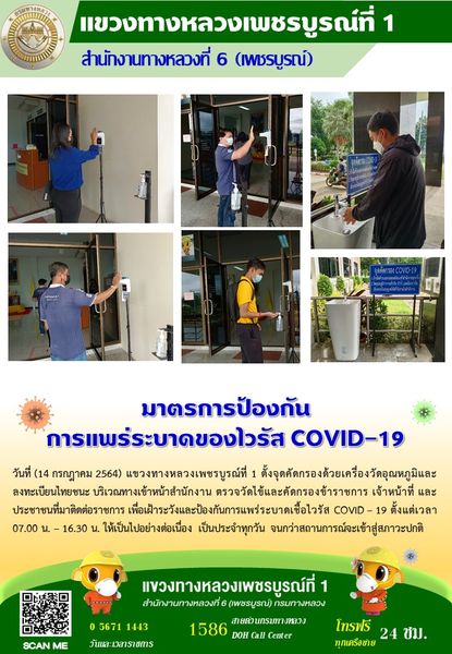 แขวงทางหลวงเพชรบูรณ์ที่ 1 จัดตั้งตู้พ่นน้ำยาฆ่าเชื้อ และจุดคัดกรองด้วยเครื่องวัดอุณหภูมิ วันที่14 กรกฎาคม 2564 ตั้งแต่เวลา 07.00 น. – 16.30 น.