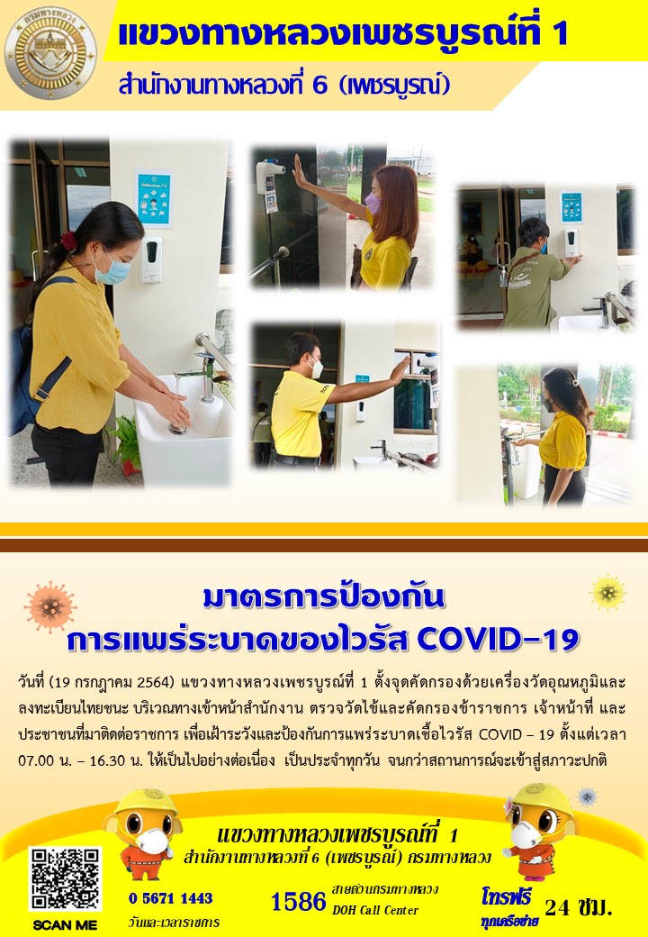 แขวงทางหลวงเพชรบูรณ์ที่ 1 จัดตั้งตู้พ่นน้ำยาฆ่าเชื้อ และจุดคัดกรองด้วยเครื่องวัดอุณหภูมิ วันที่19 กรกฎาคม 2564 ตั้งแต่เวลา 07.00 น. – 16.30 น.
