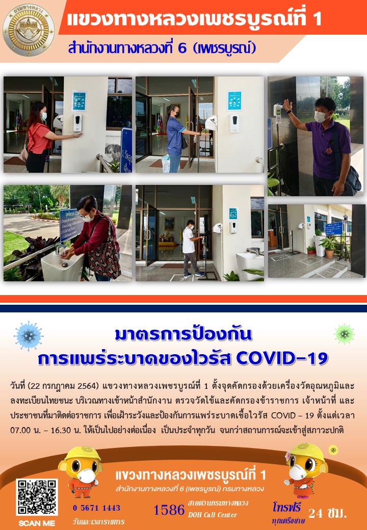 แขวงทางหลวงเพชรบูรณ์ที่ 1 จัดตั้งตู้พ่นน้ำยาฆ่าเชื้อ และจุดคัดกรองด้วยเครื่องวัดอุณหภูมิ วันที่22 กรกฎาคม 2564 ตั้งแต่เวลา 07.00 น. – 16.30 น.