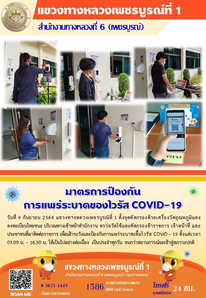 แขวงทางหลวงเพชรบูรณ์ที่ 1 จัดตั้งตู้พ่นน้ำยาฆ่าเชื้อ และจุดคัดกรองด้วยเครื่องวัดอุณหภูมิ วันที่ 9 กันยายน 2564 ตั้งแต่เวลา 07.00 น. – 16.300