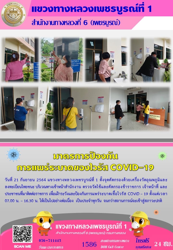 แขวงทางหลวงเพชรบูรณ์ที่ 1 จัดตั้งตู้พ่นน้ำยาฆ่าเชื้อ และจุดคัดกรองด้วยเครื่องวัดอุณหภูมิ วันที่ 21 กันยายน 2564 ตั้งแต่เวลา 07.00 น. – 16.30 น.
