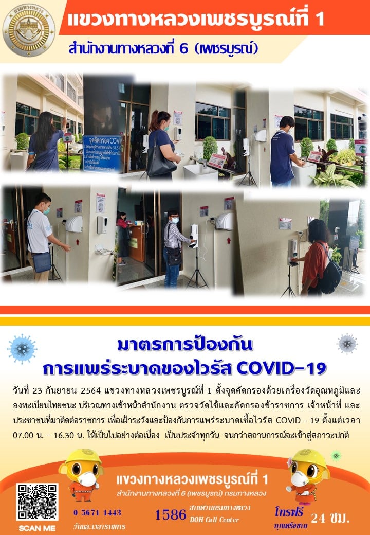 แขวงทางหลวงเพชรบูรณ์ที่ 1 จัดตั้งตู้พ่นน้ำยาฆ่าเชื้อ และจุดคัดกรองด้วยเครื่องวัดอุณหภูมิ วันที่ 23 กันยายน 2564 ตั้งแต่เวลา 07.00 น. – 16.30 น.