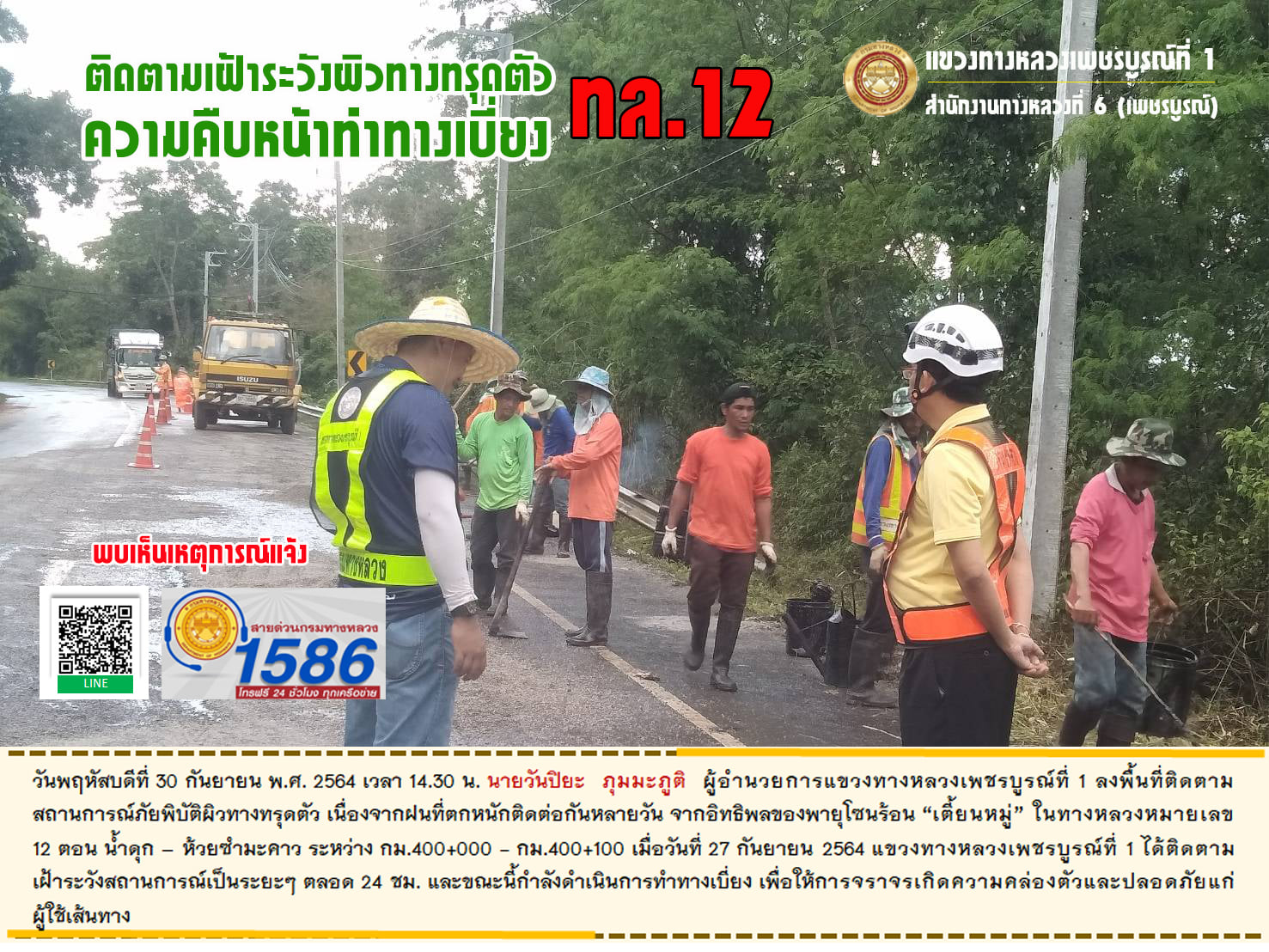 วันพฤหัสบดีที่ 30 กันยายน พ.ศ. 2564 เวลา 14.30 น. นายวันปิยะ ภุมมะภูติ ผู้อำนวยการแขวงทางหลวงเพชรบูรณ์ที่ 1 ลงพื้นที่ติดตามสถานการณ์ภัยพิบัติผิวทางทรุดตัว เนื่องจากฝนที่ตกหนักติดต่อกันหลายวัน จากอิทธิพลของพายุโซนร้อน “เตี้ยนหมู่” ในทางหลวงหมายเลข 12 ตอน น้ำดุก – ห้วยซำมะคาว ระหว่าง กม.400+000 - กม.400+100 เมื่อวันที่ 27 กันยายน 2564