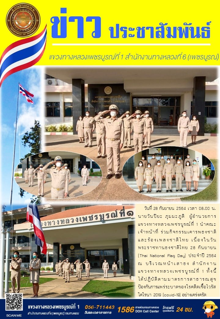 วันที่ 28 กันยายน 2564 เวลา 08.00 น. นายวันปิยะ ภุมมะภูติ ผู้อำนวยการแขวงทางหลวงเพชรบูรณ์ที่ 1 นำคณะเจ้าหน้าที่ ร่วมกิจกรรมเคารพธงชาติและร้องเพลงชาติไทย เนื่องในวันพระราชทานธงชาติไทย 28 กันยายน (Thai National Flag Day) ประจำปี 2564 ณ บริเวณหน้าเสาธง สำนักงานแขวงทางหลวงเพชรบูรณ์ที่ 1 ทั้งนี้ ได้ปฏิบัติตามมาตรการสาธารณสุข ป้องกันการแพร่ระบาดของโรคติดเชื้อไวรัสโคโรนา 2019 (covid-19) อย่างเคร่งครัด