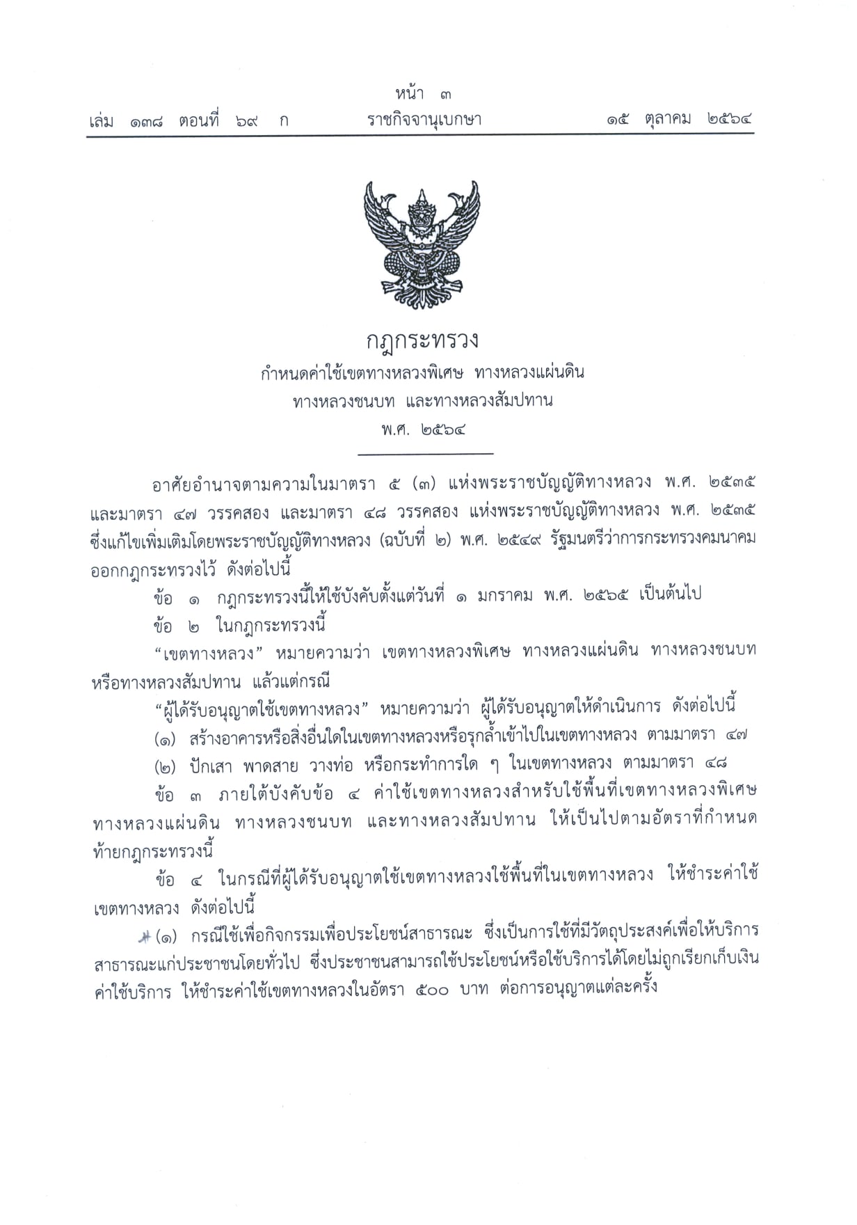 กฎกระทรวง กำหนดค่าใช้เขตทางหลวงพิเศษ ทางหลวงแผ่นดิน ทางหลวงชนบท และทางหลวงสัมปทาน พ.ศ.2564
