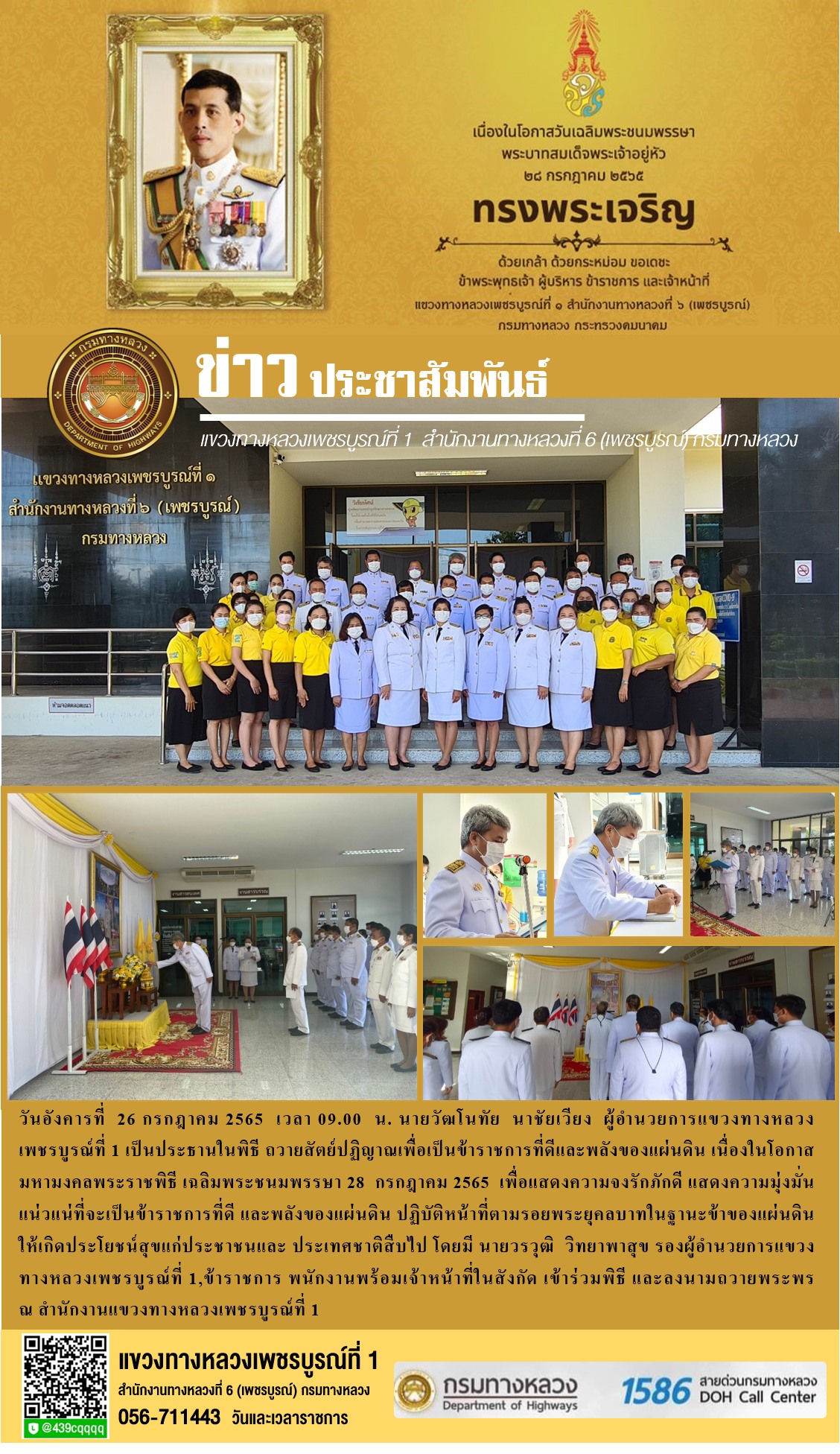 วันอังคารที่ 26 กรกฎาคม 2565 เวลา 09.00 น. นายวัฒโนทัย นาชัยเวียง ผู้อำนวยการแขวงทางหลวงเพชรบูรณ์ที่ 1 เป็นประธานในพิธี ถวายสัตย์ปฏิญาณเพื่อเป็นข้าราชการที่ดีและพลังของแผ่นดิน เนื่องในโอกาสมหามงคลพระราชพิธี เฉลิมพระชนมพรรษา 28 กรกฎาคม 2565 เพื่อแสดงความจงรักภักดี แสดงความมุ่งมั่นแน่วแน่ที่จะเป็นข้าราชการที่ดี และพลังของแผ่นดิน ปฏิบัติหน้าที่ตามรอยพระยุคลบาทในฐานะข้าของแผ่นดินให้เกิดประโยชน์สุขแก่ประชาชนและ ประเทศชาติสืบไป โดยมี นายวรวุฒิ วิทยาพาสุข รองผู้อำนวยการแขวงทางหลวงเพชรบูรณ์ที่ 1,ข้าราชการ พนักงานพร้อมเจ้าหน้าที่ในสังกัด เข้าร่วมพิธี และลงนามถวายพระพร ณ สำนักงานแขวงทางหลวงเพชรบูรณ์ที่ 1
