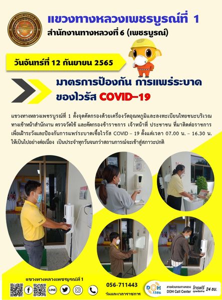 วันจันทร์ที่ 12 กันยายน 2565 แขวงทางหลวงเพชรบูรณ์ที่ 1 ตั้งจุดคัดกรองด้วยเครื่องวัดอุณหภูมิและลงทะเบียนไทยชนะบริเวณทางเข้าหน้าสำนักงาน ตรวจวัดไข้ และคัดกรองข้าราชการ เจ้าหน้าที่ ประชาชน ที่มาติดต่อราชการเพื่อเฝ้าระวังและป้องกันการแพร่ระบาดเชื้อไวรัส COVID – 19 ตั้งแต่เวลา 07.00 น. – 16.30 น. ให้เป็นไปอย่างต่อเนื่อง เป็นประจำทุกวันจนกว่าสถานการณ์จะเข้าสู่สภาวะปกติ