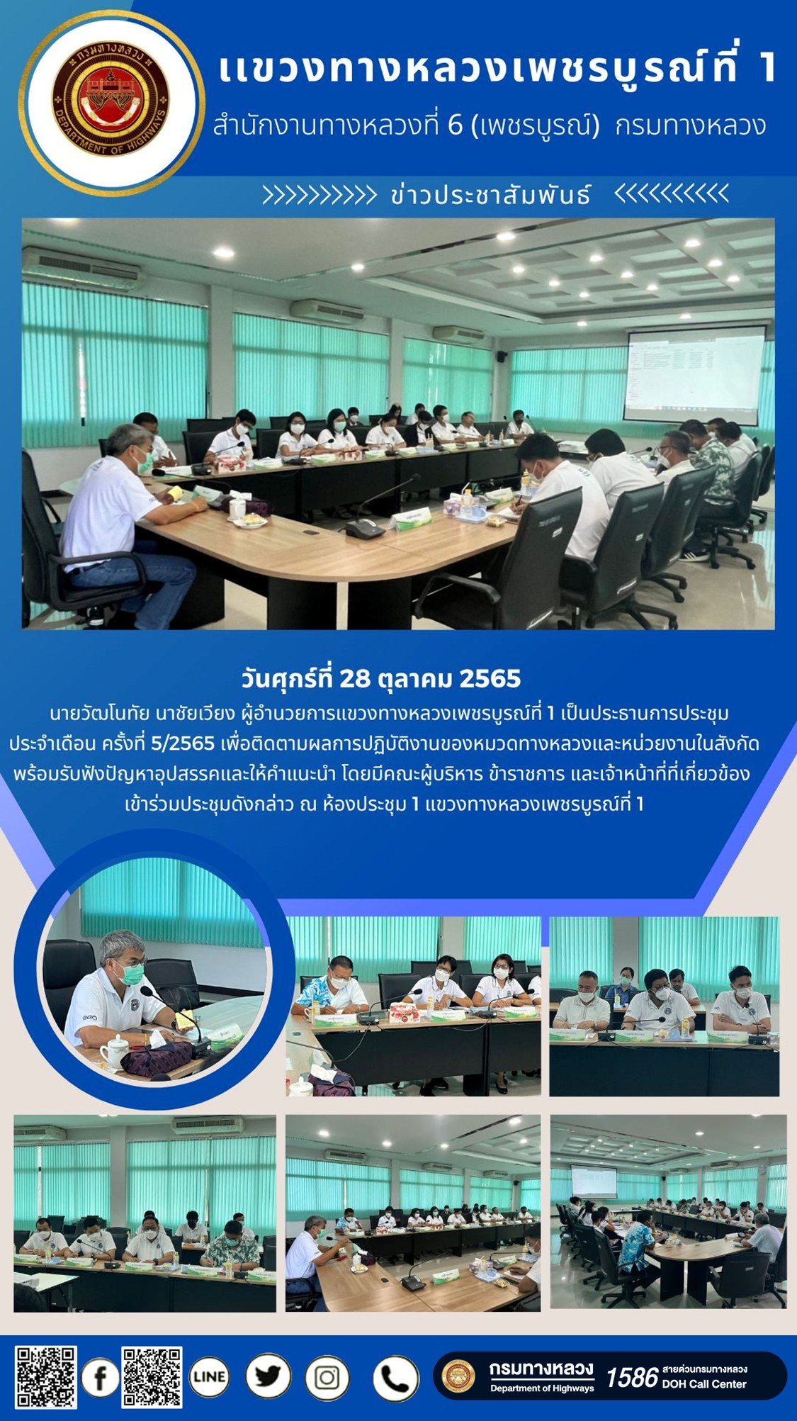 วันศุกร์ที่ 28 ตุลาคม 2565 นายวัฒโนทัย นาชัยเวียง ผู้อำนวยการแขวงทางหลวงเพชรบูรณ์ที่ 1 เป็นประธานการประชุมประจำเดือน ครั้งที่ 5/2565 เพื่อติดตามผลการปฏิบัติงานของหมวดทางหลวงและหน่วยงานในสังกัด พร้อมรับฟังปัญหาอุปสรรคและให้คำแนะนำ โดยมีคณะผู้บริหาร ข้าราชการ และเจ้าหน้าที่ที่เกี่ยวข้องเข้าร่วมประชุมดังกล่าว ณ ห้องประชุม 1แขวงทางหลวงเพชรบูรณ์ที่ 1