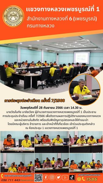 วันพฤหัสบดีที่ 28 กันยายน 2566 เวลา 14.30 น. นายวัฒโนทัย นาชัยเวียง ผู้อำนวยการแขวงทางหลวงเพชรบูรณ์ที่ 1 เป็นประธาน การประชุมประจำเดือน ครั้งที่ 7/2566 เพื่อติดตามผลการปฏิบัติงานของหมวดทางหลวงและหน่วยงานในสังกัด พร้อมรับฟังปัญหาอุปสรรคและให้คำแนะนำ โดยมีคณะผู้บริหาร ข้าราชการ และเจ้าหน้าที่ที่เกี่ยวข้อง เข้าร่วมประชุมดังกล่าว ณ ห้องประชุม 1 แขวงทางหลวงเพชรบูรณ์ที่ 1