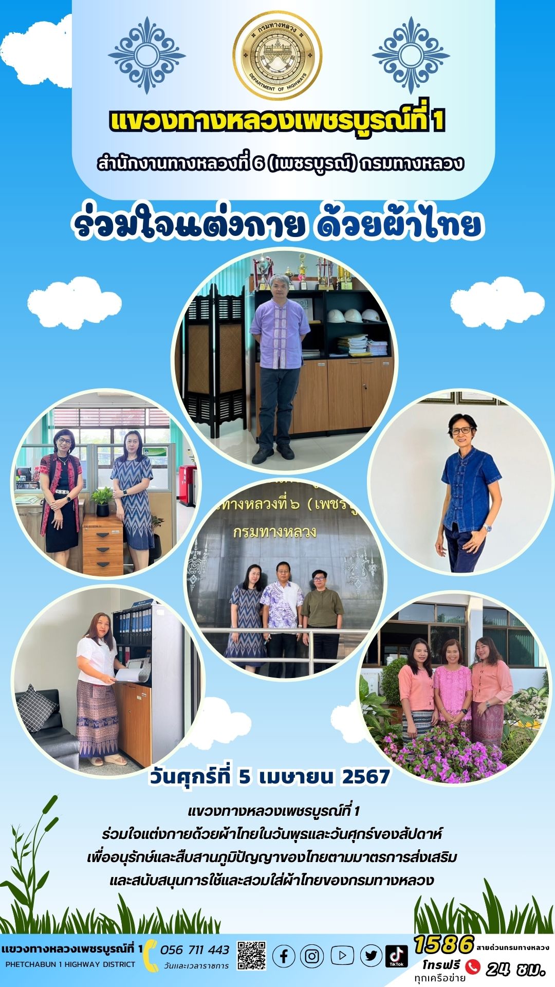 แขวงทางหลวงเพชรบูรณ์ที่ 1 ร่วมใจแต่งกายด้วยผ้าไทยในวันพุธและวันศุกร์ของสัปดาห์เพื่ออนุรักษ์และสืบสานภูมิปัญญาของไทย ตามมาตรการส่งเสริมและสนับสนุนการใช้ และสวมใส่ผ้าไทยของกรมทางหลวง
