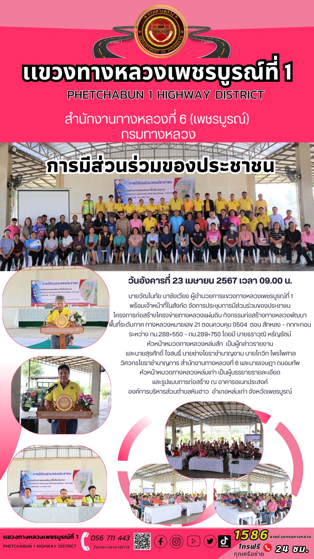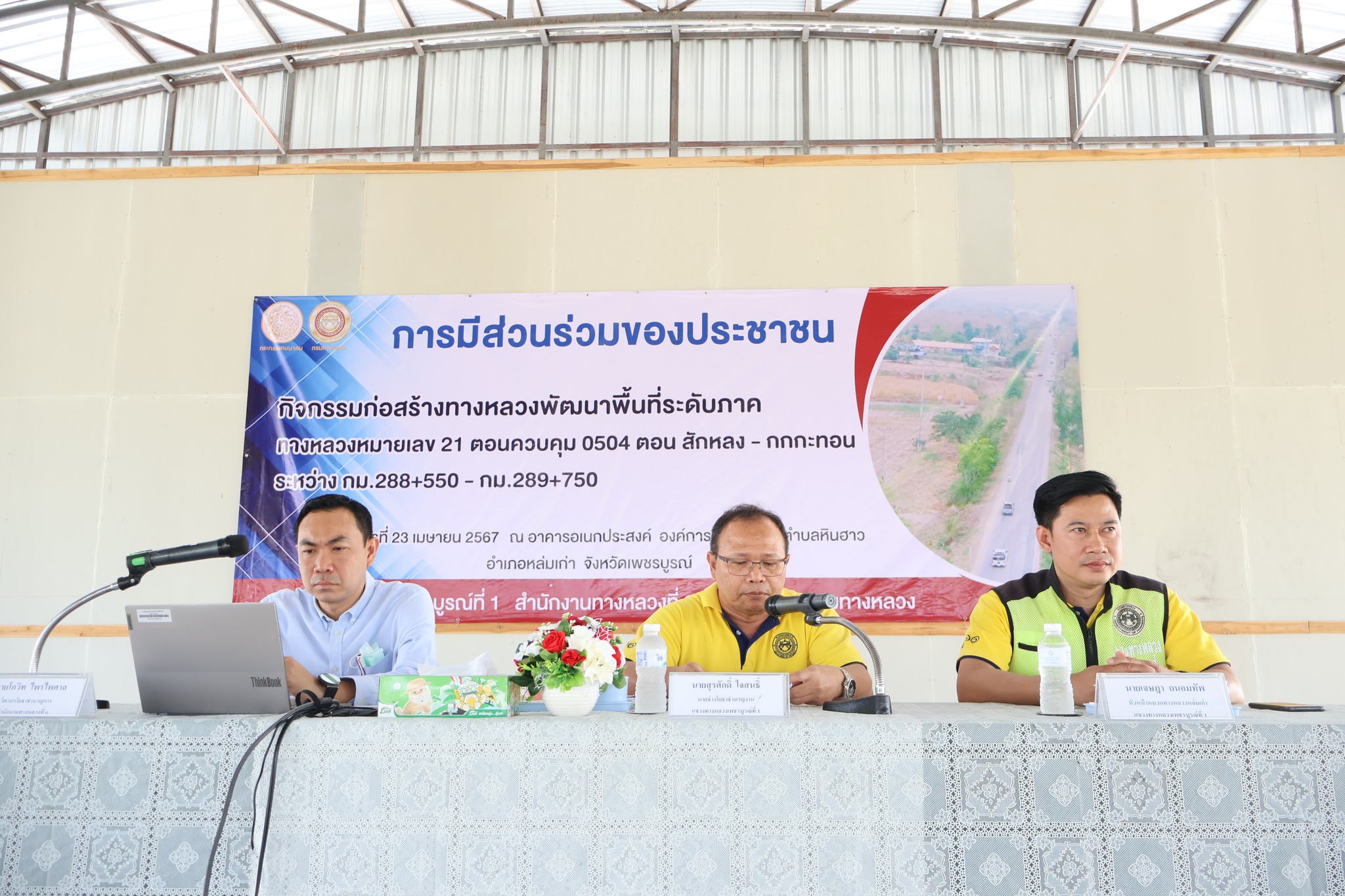 นายวัฒโนทัย นาชัยเวียง ผู้อำนวยการแขวงทางหลวงเพชรบูรณ์ที่ 1 พร้อมเจ้าหน้าที่ในสังกัด จัดการประชุมการมีส่วนร่วมของประชาชน โครงการก่อสร้างโครงข่ายทางหลวงแผ่นดิน กิจกรรมก่อสร้างทางหลวงพัฒนาพื้นที่ระดับภาค ทางหลวงหมายเลข 21 ตอนควบคุม 0504 ตอน สักหลง – กกกะทอน ระหว่าง กม.288+550 – กม.289+750 โดยมี นายธราวุฒิ หรัญรัตน์ หัวหน้าหมวดทางหลวงหล่มสัก เป็นผู้กล่าวรายงาน เเละนายสุรศักดิ์ ใจสนธิ์ นายช่างโยธาชำนาญงาน นายโกวิท ไพรไพศาล วิศวกรโยธาชำนาญการ สำนักงานทางหลวงที่ 6 เเละนายเจษฎา ถนอมทัพ หัวหน้าหมวดทางหลวงหล่มเก่า เป็นผู้บรรยายรายละเอียด และรูปแบบการก่อสร้าง ณ อาคารอเนกประสงค์องค์การบริหารส่วนตำบลหินฮาว อำเภอหล่มเก่า จังหวัดเพชรบูรณ์