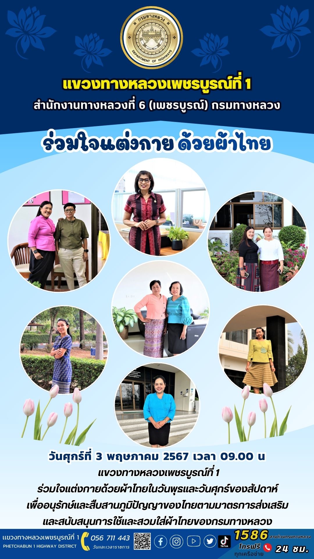 วันศุกร์ที่ 3 พฤษภาคม 2567 เวลา 09.00 น แขวงทางหลวงเพชรบูรณ์ที่ 1 ร่วมใจแต่งกายด้วยผ้าไทยในวันพุธและวันศุกร์ของสัปดาห์ เพื่ออนุรักษ์และสืบสานภูมิปัญญาของไทยตามมาตรการส่งเสริม และสนับสนุนการใช้และสวมใส่ผ้าไทยของกรมทางหลวง