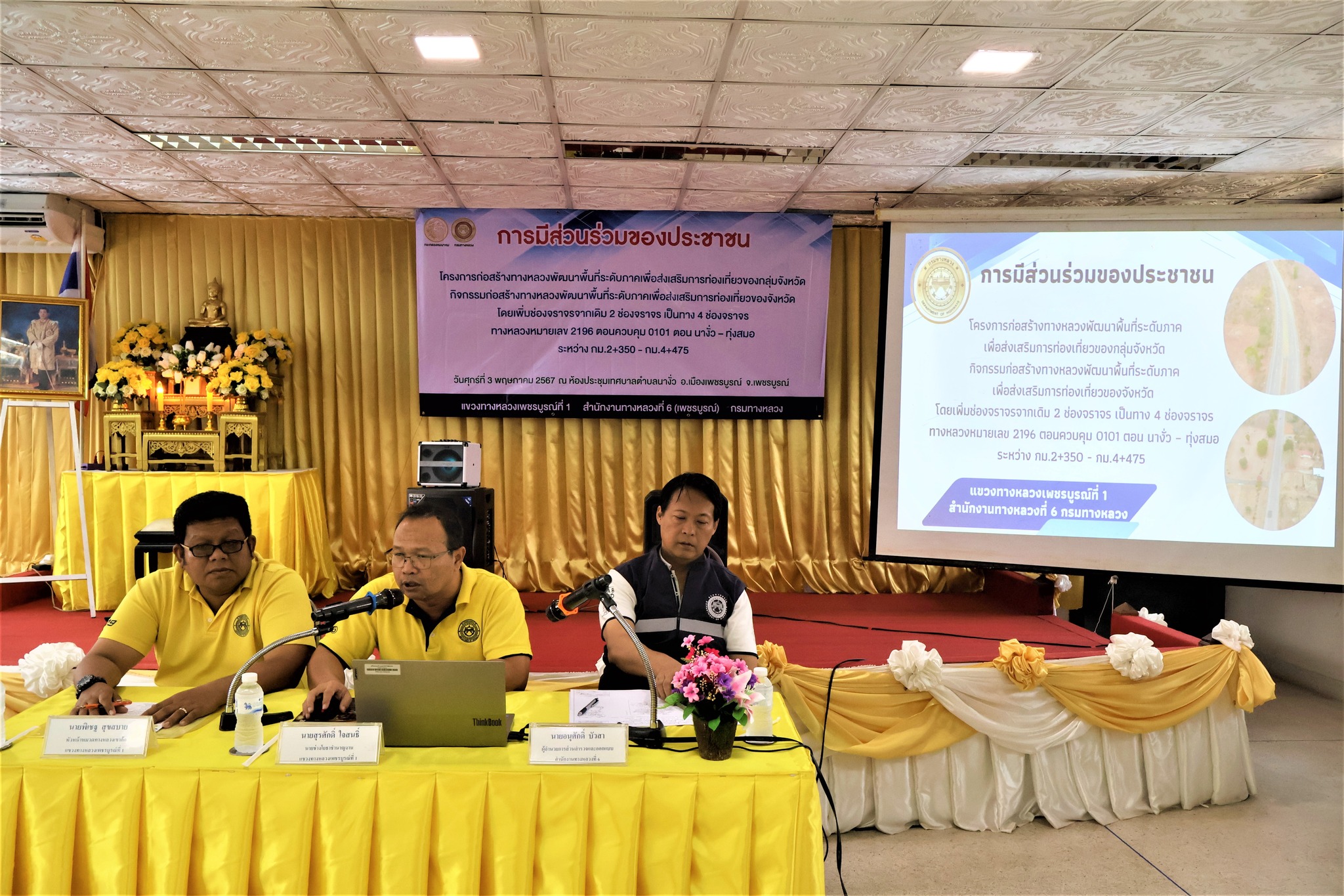 จัดการประชุมการมีส่วนร่วมของประชาชน โครงการก่อสร้างทางหลวงพัฒนาพื้นที่ระดับภาคเพื่อส่งเสริมการท่องเที่ยวของกลุ่มจังหวัด กิจกรรมก่อสร้างทางหลวงพัฒนาพื้นที่ระดับภาคเพื่อส่งเสริมการท่องเที่ยวของจังหวัด โดยเพิ่มช่องจราจร จากเดิม 2 ช่องจราจร เป็นทาง 4 ช่องจราจร ทางหลวงหมายเลข 2196 ตอนควบคุม 0101 ตอน นางั่ว – ทุ่งสมอ ระหว่าง กม.2+350 – กม.4+475