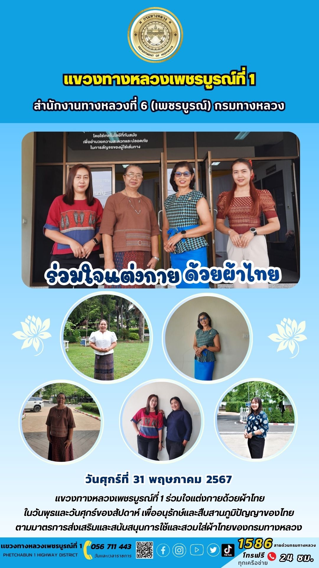 วันศุกร์ที่ 31 พฤษภาคม 2567 แขวงทางหลวงเพชรบูรณ์ที่ 1 ร่วมใจแต่งกายด้วยผ้าไทยในวันพุธและวันศุกร์ของสัปดาห์ เพื่ออนุรักษ์และสืบสานภูมิปัญญาของไทยตามมาตรการส่งเสริมและสนับสนุนการใช้และสวมใส่ผ้าไทยของกรมทางหลวง