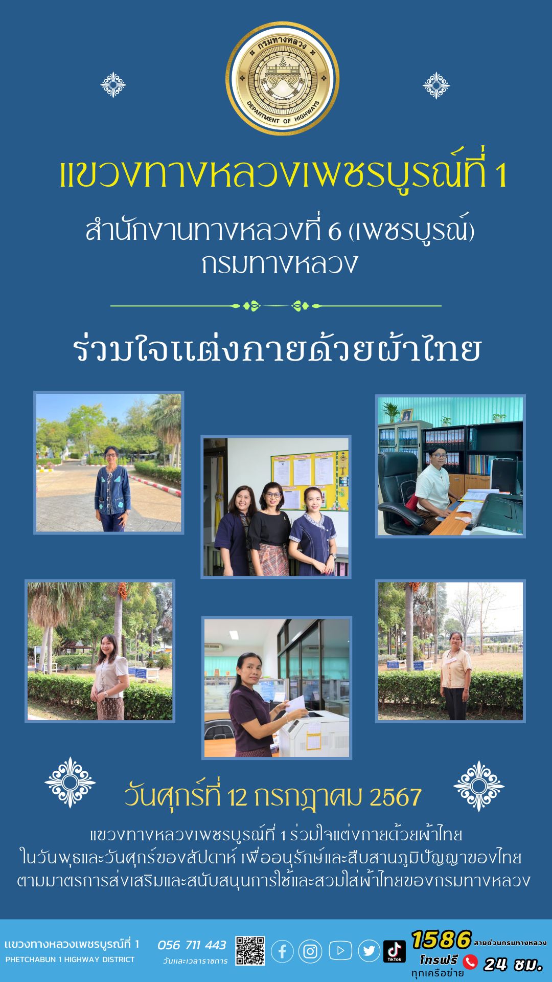 วันศุกร์ที่ 12 กรกฎาคม 2567 แขวงทางหลวงเพชรบูรณ์ที่ 1 ร่วมใจแต่งกายด้วยผ้าไทยในวันพุธและวันศุกร์ของสัปดาห์ เพื่ออนุรักษ์และสืบสานภูมิปัญญาของไทยตามมาตรการส่งเสริมและสนับสนุนการใช้และสวมใส่ผ้าไทยของกรมทางหลวง