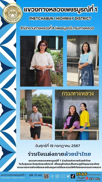 วันศุกร์ที่ 19 กรกฎาคม 2567 แขวงทางหลวงเพชรบูรณ์ที่ 1 ร่วมใจแต่งกายด้วยผ้าไทยในวันพุธและวันศุกร์ของสัปดาห์ เพื่ออนุรักษ์และสืบสานภูมิปัญญาของไทย ตามมาตรการส่งเสริมและสนับสนุนการใช้และสวมใส่ผ้าไทยของกรมทางหลวง