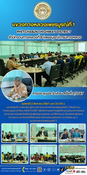วันศุกร์ที่ 2 สิงหาคม 2567 เวลา 10.00 น นายวัฒโนทัย นาชัยเวียง ผู้อำนวยการแขวงทางหลวงเพชรบูรณ์ที่ 1 เป็นประธาน การประชุมประจำเดือน ครั้งที่ 2/2567 เพื่อติดตามผลการปฏิบัติงานของหมวดทางหลวง และหน่วยงานในสังกัดพร้อมรับฟังปัญหาอุปสรรค และให้คำแนะนำ โดยมีคณะผู้บริหาร ข้าราชการ และเจ้าหน้าที่ที่เกี่ยวข้อง เข้าร่วมประชุมดังกล่าว ณ ห้องประชุม 1 แขวงทางหลวงเพชรบูรณ์ที่ 1