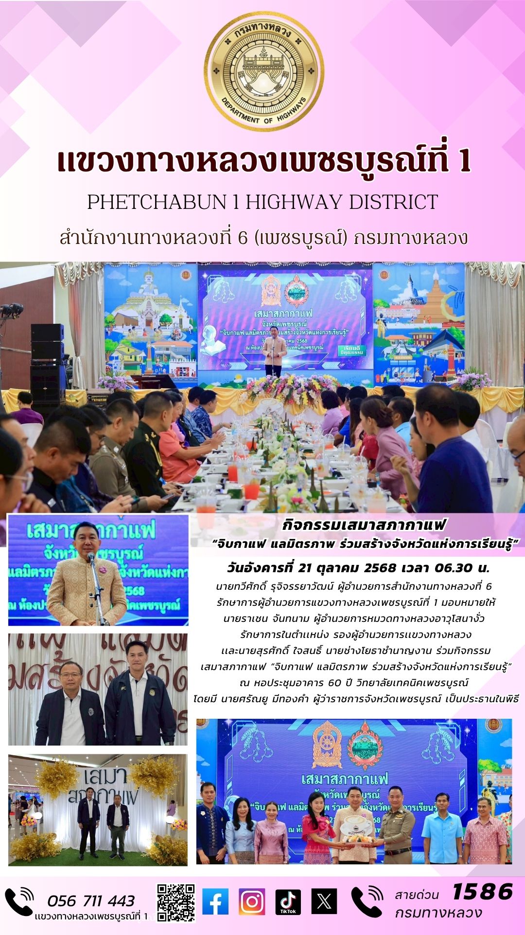 วันอังคารที่ 21 ตุลาคม 2568 เวลา 06.30 น.นายทวีศักดิ์ รุจิจรรยาวัฒน์ ผู้อำนวยการสำนักงานทางหลวงที่ 6 รักษาการผู้อำนวยการแขวงทางหลวงเพชรบูรณ์ที่ 1 มอบหมายให้นายราเชน จันทนาม ผู้อำนวยการหมวดทางหลวงอาวุโสนางั่ว รักษาการในตำเเหน่ง รองผู้อำนวยการเเขวงทางหลวง เเละนายสุรศักดิ์ ใจสนธิ์ นายช่างโยธาชำนาญงาน ร่วมกิจกรรมเสมาสภากาแฟ “จิบกาแฟ แลมิตรภาพ ร่วมสร้างจังหวัดแห่งการเรียนรู้” ณ หอประชุมอาคาร 60 ปี วิทยาลัยเทคนิคเพชรบูรณ์ โดยมี นายศรัณยู มีทองคำ ผู้ว่าราชการจังหวัดเพชรบูรณ์ เป็นประธานในพิธี