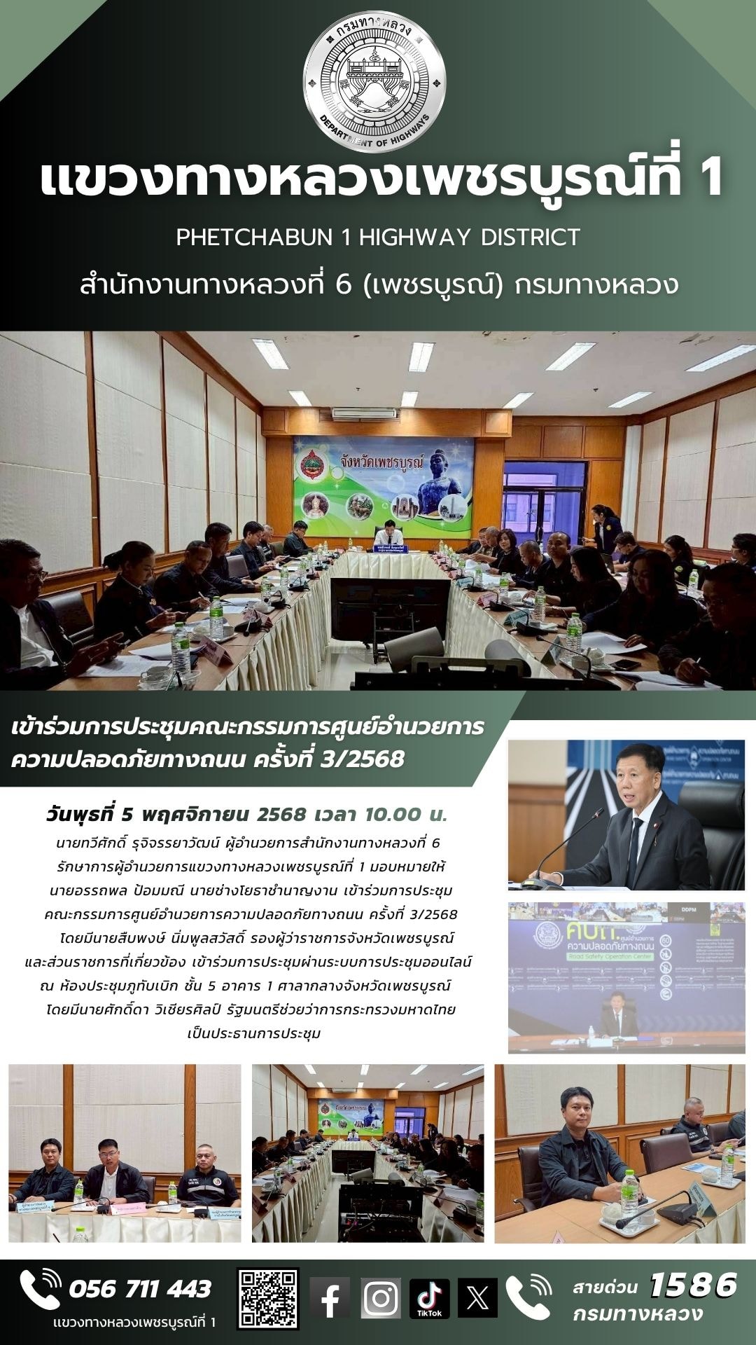 นายทวีศักดิ์ รุจิจรรยาวัฒน์ ผู้อำนวยการสำนักงานทางหลวงที่ 6 รักษาการผู้อำนวยการแขวงทางหลวงเพชรบูรณ์ที่ 1 มอบหมายให้ นายอรรถพล ป้อมมณี นายช่างโยธาชำนาญงาน เข้าร่วมการประชุมคณะกรรมการศูนย์อำนวยการความปลอดภัยทางถนน ครั้งที่ 3/2568 โดยมีนายสืบพงษ์ นิ่มพูลสวัสดิ์ รองผู้ว่าราชการจังหวัดเพชรบูรณ์ และส่วนราชการที่เกี่ยวข้อง เข้าร่วมการประชุมผ่านระบบการประชุมออนไลน์ ณ ห้องประชุมภูทับเบิก ชั้น 5 อาคาร 1 ศาลากลางจังหวัดเพชรบูรณ์ โดยมีนายศักดิ์ดา วิเชียรศิลป์ รัฐมนตรีช่วยว่าการกระทรวงมหาดไทย เป็นประธานการประชุม