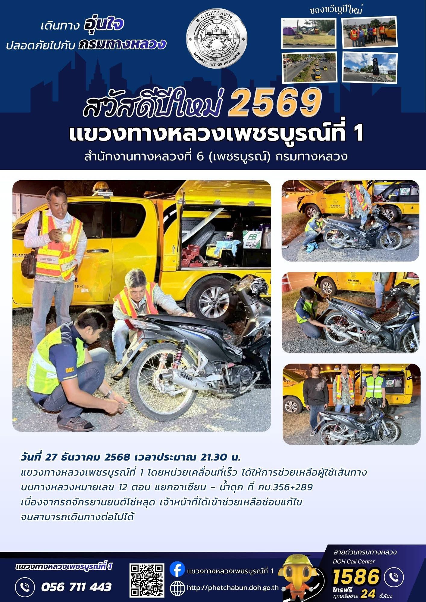 แขวงทางหลวงเพชรบูรณ์ที่ 1 โดยหน่วยเคลื่อนที่เร็ว ได้ให้การช่วยเหลือผู้ใช้เส้นทาง บนทางหลวงหมายเลข 12 ตอน แยกอาเซียน - น้ำดุก ที่ กม.356+289 เนื่องจากรถจักรยานยนต์โซ่หลุด เจ้าหน้าที่ได้เข้าช่วยเหลือซ่อมแก้ไข จนสามารถเดินทางต่อไปได้