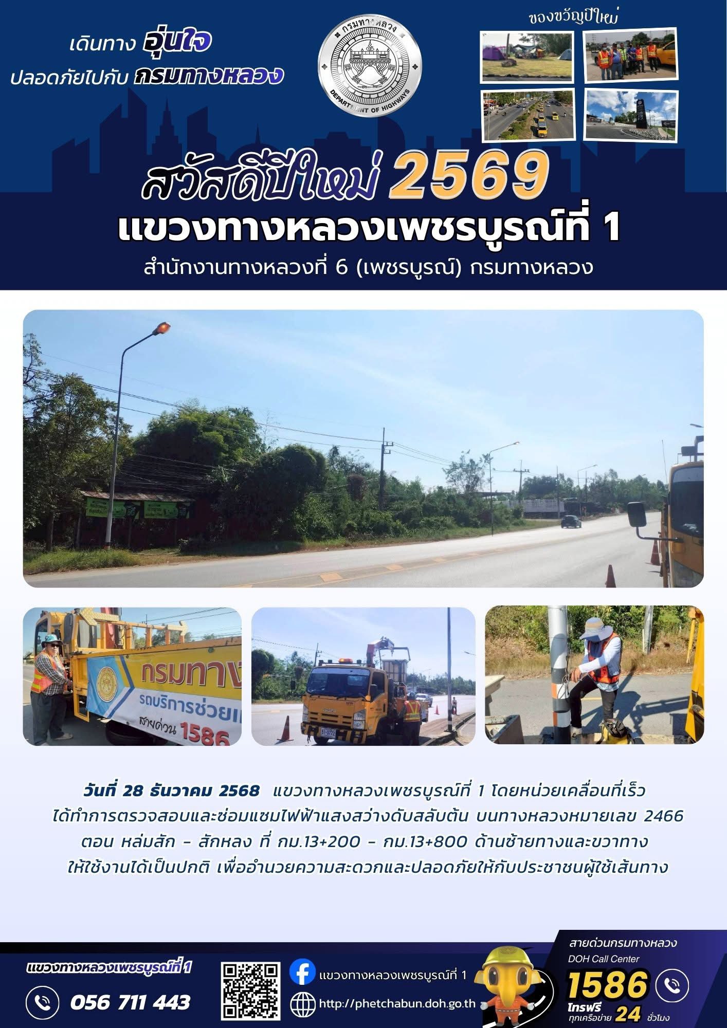 แขวงทางหลวงเพชรบูรณ์ที่ 1 โดยหน่วยเคลื่อนที่เร็ว ได้ทำการตรวจสอบและซ่อมแซมไฟฟ้าแสงสว่างดับสลับต้น บนทางหลวงหมายเลข 2466 ตอน หล่มสัก - สักหลง ที่ กม.13+200 - กม.13+800 ด้านซ้ายทางและขวาทาง ให้ใช้งานได้เป็นปกติ เพื่ออำนวยความสะดวกและปลอดภัยให้กับประชาชนผู้ใช้เส้นทาง