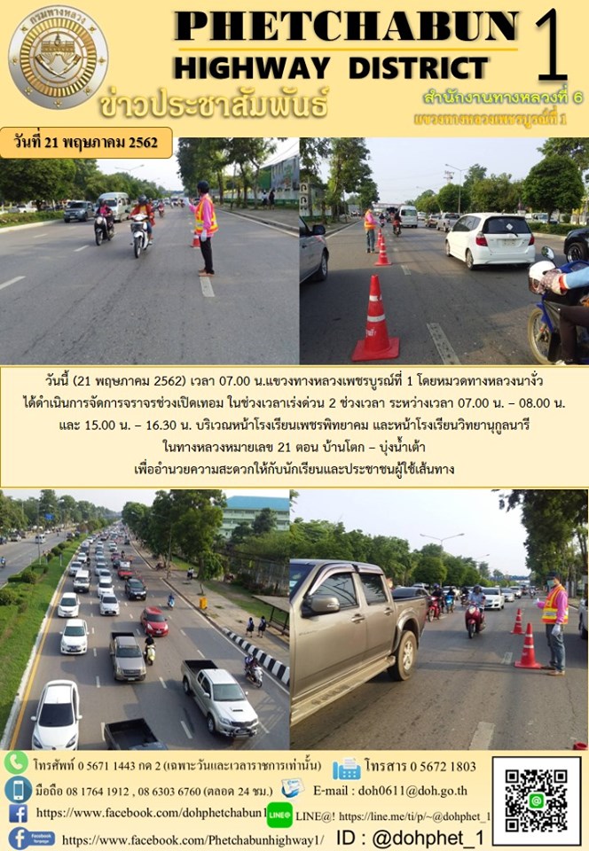 วันนี้ (21 พฤษภาคม 2562) เวลา 07.00 น. แขวงทางหลวงเพชรบูรณ์ที่ 1 โดยหมวดทางหลวงนางั่ว ได้ดำเนินการจัดการจราจรช่วงเปิดเทอม ในช่วงเวลาเร่งด่วน 2 ช่วงเวลา ระหว่างเวลา 07.00 น. – 08.00 น. และ 15.00 น. – 16.30 น. บริเวณหน้าโรงเรียนเพชรพิทยาคม และหน้าโรงเรียนวิทยานุกูลนารี ในทางหลวงหมายเลข 21 ตอน บ้านโตก – บุ่งน้ำเต้า เพื่ออำนวยความสะดวกให้กับนักเรียนและประชาชนผู้ใช้เส้นทาง