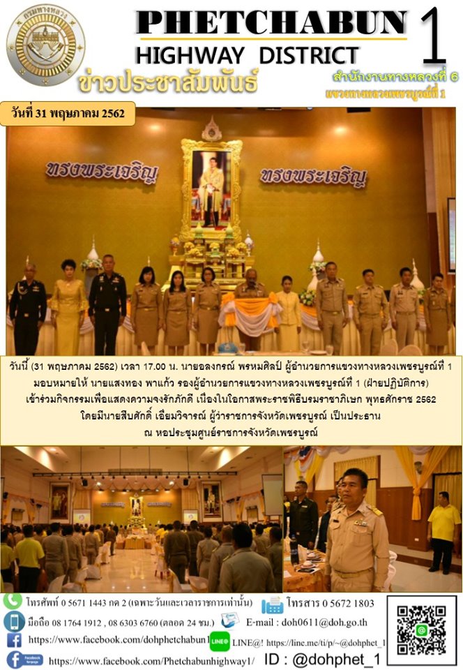วันนี้ (31 พฤษภาคม 2562) เวลา 17.00 น. นายอลงกรณ์ พรหมศิลป์ ผู้อำนวยการแขวงทางหลวงเพชรบูรณ์ที่ 1 มอบหมายให้ นายแสงทอง พาแก้ว รองผู้อำนวยการแขวงทางหลวงเพชรบูรณ์ที่ 1 (ฝ่ายปฏิบัติการ) เข้าร่วมกิจกรรมเพื่อแสดงความจงรักภักดี เนื่องในโอกาสพระราชพิธีบรมราชาภิเษก พุทธศักราช 2562 โดยมีนายสืบศักดิ์ เอี่ยมวิจารณ์ ผู้ว่าราชการจังหวัดเพชรบูรณ์ เป็นประธาน ณ หอประชุมศูนย์ราชการจังหวัดเพชรบูรณ์