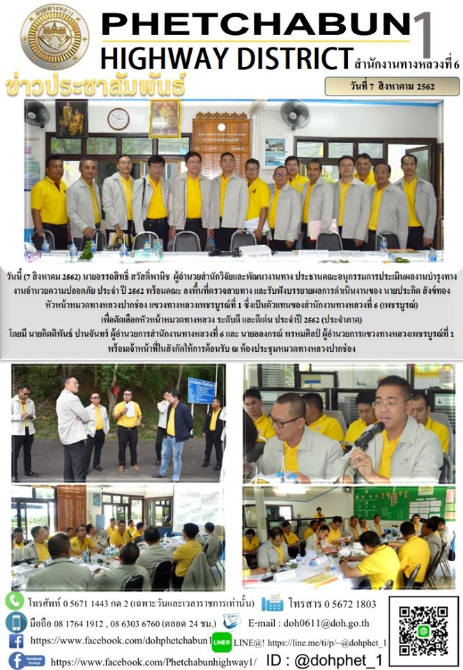 วันนี้ (7 สิงหาคม 2562) นายอรรถสิทธิ์ สวัสดิ์พานิช ผู้อำนวยการสำนักวิจัยและพัฒนางานทาง ประธานคณะอนุกรรมการประเมินผลงานบำรุงทาง งานอำนวยความปลอดภัย ประจำ ปี 2562 พร้อมคณะ ลงพื้นที่ตรวจสายทาง และรับฟังบรรยายผลการดำเนินงานของ นายประกิต สังข์ทอง หัวหน้าหมวดทางหลวงปากช่อง แขวงทางหลวงเพชรบูรณ์ที่ 1 ซึ่งเป็นตัวแทนของสำนักงานทางหลวงที่ 6 (เพชรบูรณ์)เพื่อคัดเลือกหัวหน้าหมวดทางหลวง ระดับดี และดีเด่น ประจำปี 2562 (ประจำภาค) โดยมี นายกิตติพันธ์ ปานจันทร์ ผู้อำนวยการสำนักงานทางหลวงที่ 6 นายอลงกรณ์ พรหมศิลป์ ผู้อำนวยการแขวงทางหลวงเพชรบูรณ์ที่ 1 พร้อมเจ้าหน้าที่ในสังกัดให้การต้อนรับ ณ ห้องประชุมหมวดทางหลวงปากช่อง