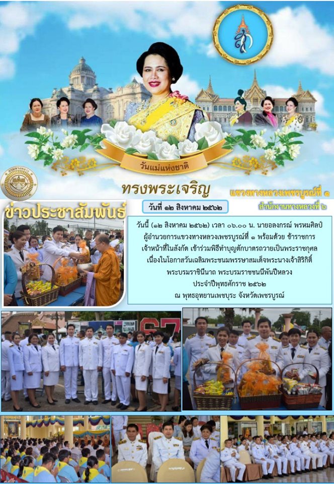 วันนี้ (12 สิงหาคม 2562) เวลา 06.00 น. นายอลงกรณ์ พรหมศิลป์ ผู้อำนวยการแขวงทางหลวงเพชรบูรณ์ที่ 1 พร้อมด้วย ข้าราชการ เจ้าหน้าที่ในสังกัด เข้าร่วมพิธีทำบุญตักบาตรถวายเป็นพระราชกุศล เนื่องในโอกาสวันเฉลิมพระชนมพรรษาสมเด็จพระนางเจ้าสิริกิติ์ พระบรมราชินีนาถ พระบรมราชชนนีพันปีหลวง ประจำปีพุทธศักราช 2562 ณ พุทธอุทยานเพชบุระ จังหวัดเพชรบูรณ์
