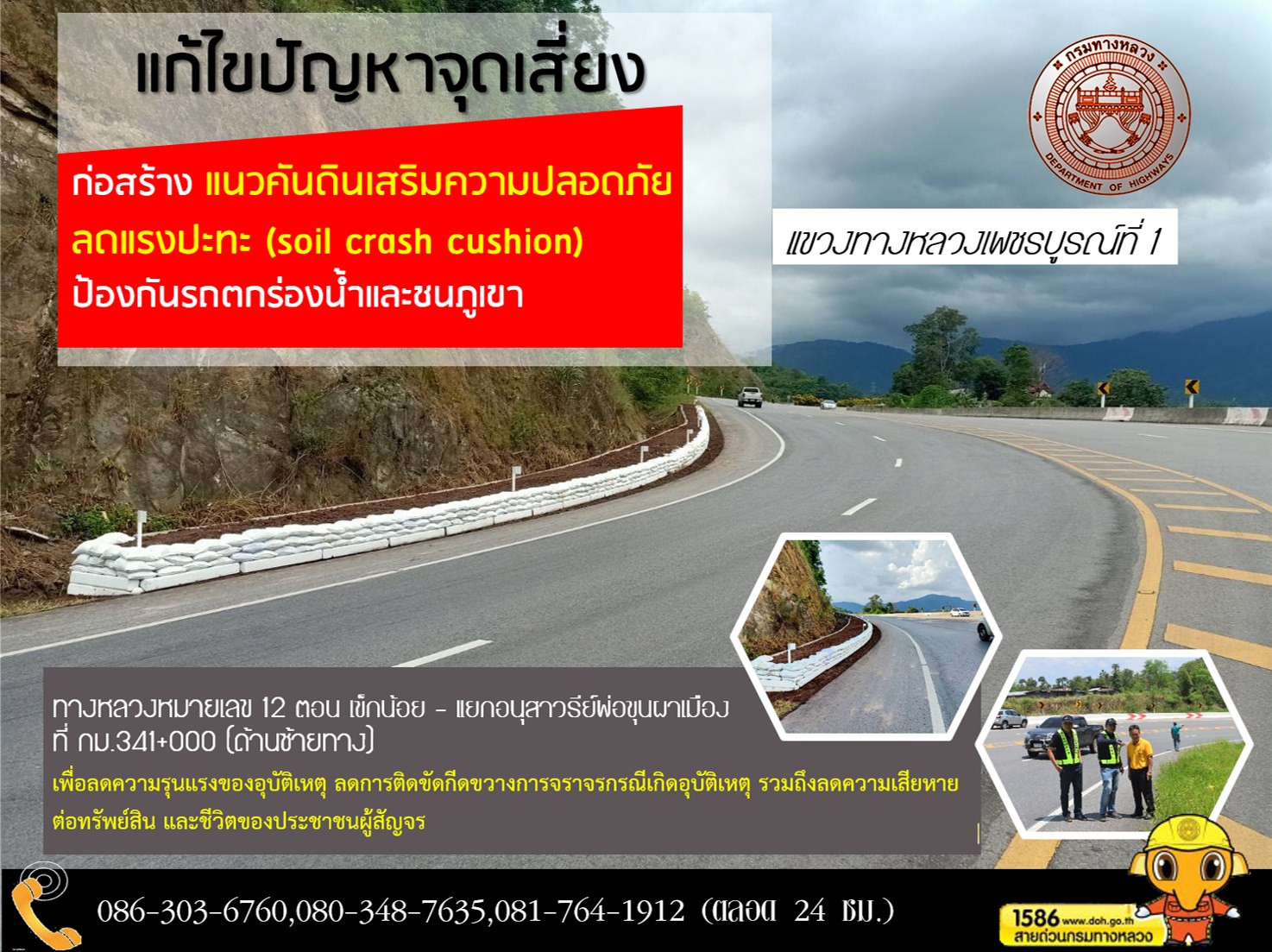 แขวงทางหลวงเพชรบูรณ์ที่ 1 จึงได้ดำเนินการก่อสร้างแนวคันดินเสริมความปลอดภัยลดแรงปะทะ (soil crash cushion) ป้องกันรถตกร่องน้ำและชนภูเขา ที่บริเวณดังกล่าว