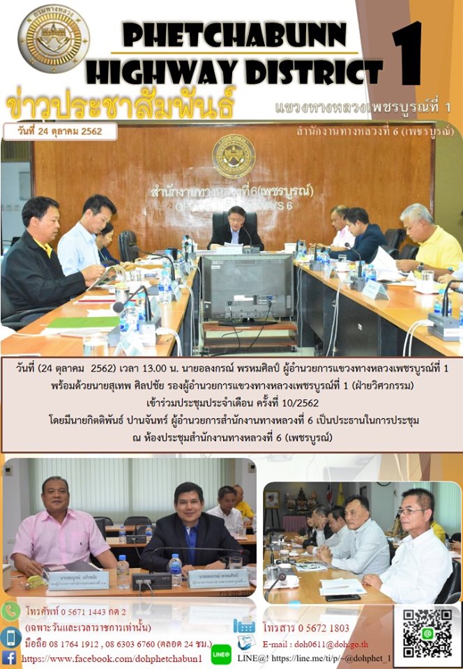 วันที่ (24 ตุลาคม 2562) เวลา 13.00 น. นายอลงกรณ์ พรหมศิลป์ ผู้อำนวยการแขวงทางหลวงเพชรบูรณ์ที่ 1 พร้อมด้วยนายสุเทพ ศิลปชัย รองผู้อำนวยการแขวงทางหลวงเพชรบูรณ์ที่ 1 (ฝ่ายวิศวกรรม) เข้าร่วมประชุมประจำเดือน ครั้งที่ 10/2562 โดยมีนายกิตติพันธ์ ปานจันทร์ ผู้อำนวยการสำนักงานทางหลวงที่ 6 เป็นประธานในการประชุม ณ ห้องประชุมสำนักงานทางหลวงที่ 6